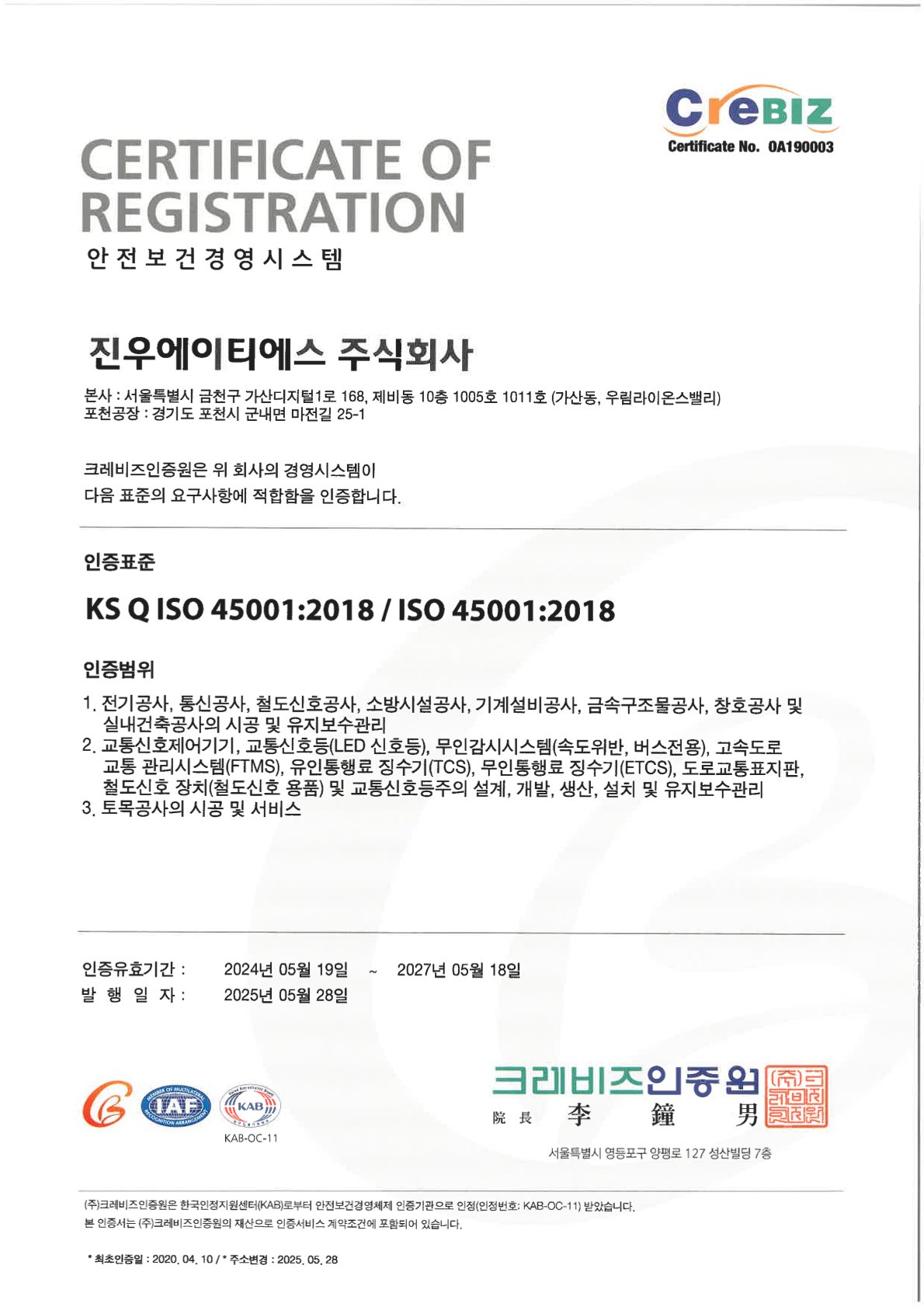 Certificate for ISO 45001